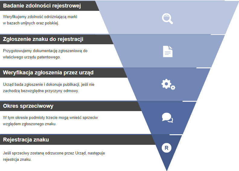 Weryfikacja znaku, ustalenie klasyfikacji nicejskiej, sporządzenie wniosku do EUIPO, bieżący nadzór nad sprawą.